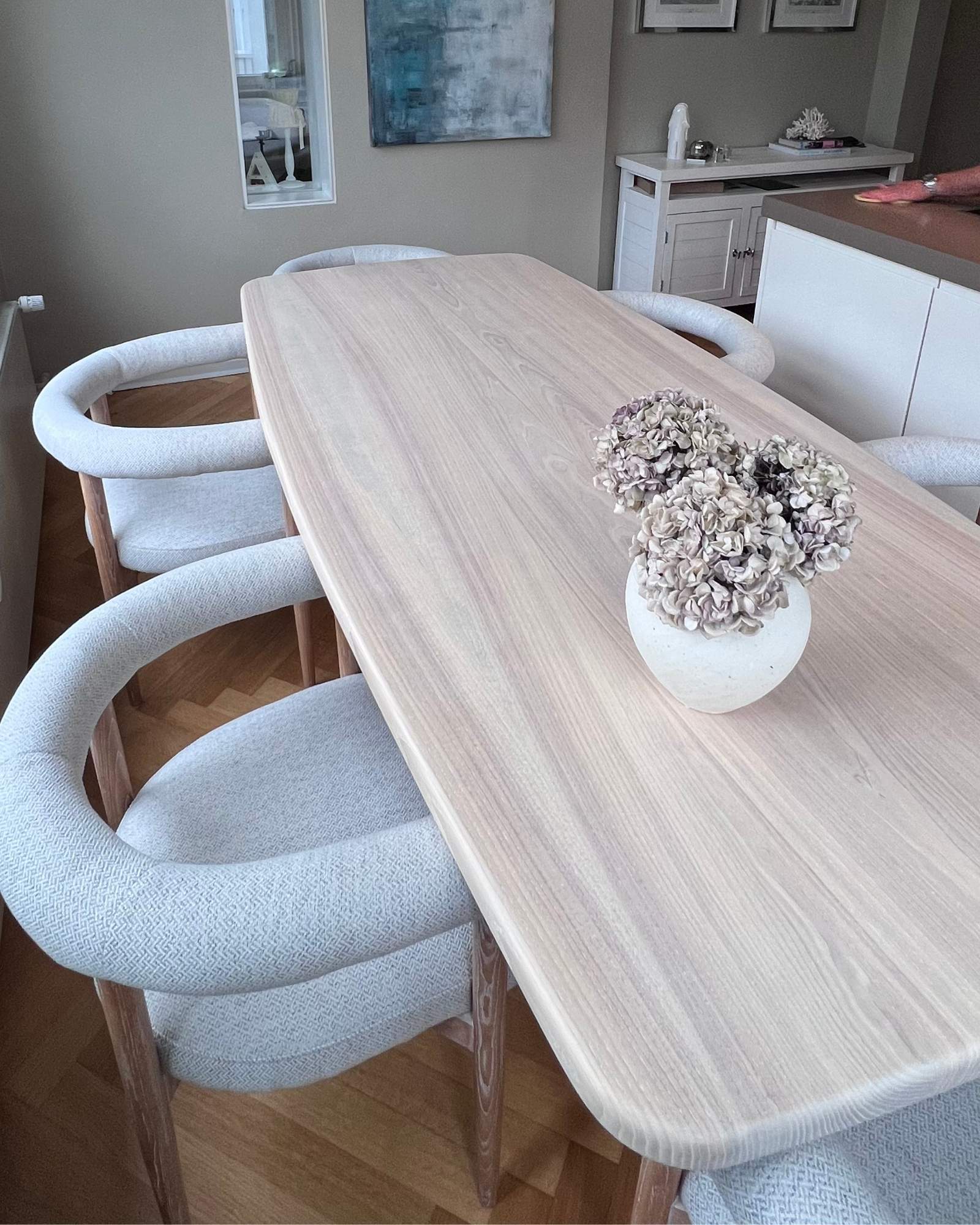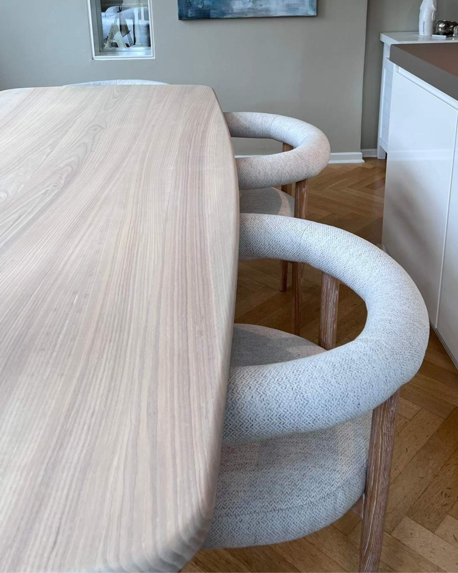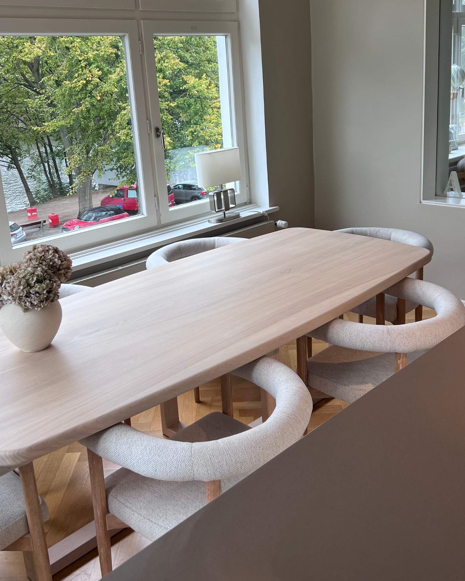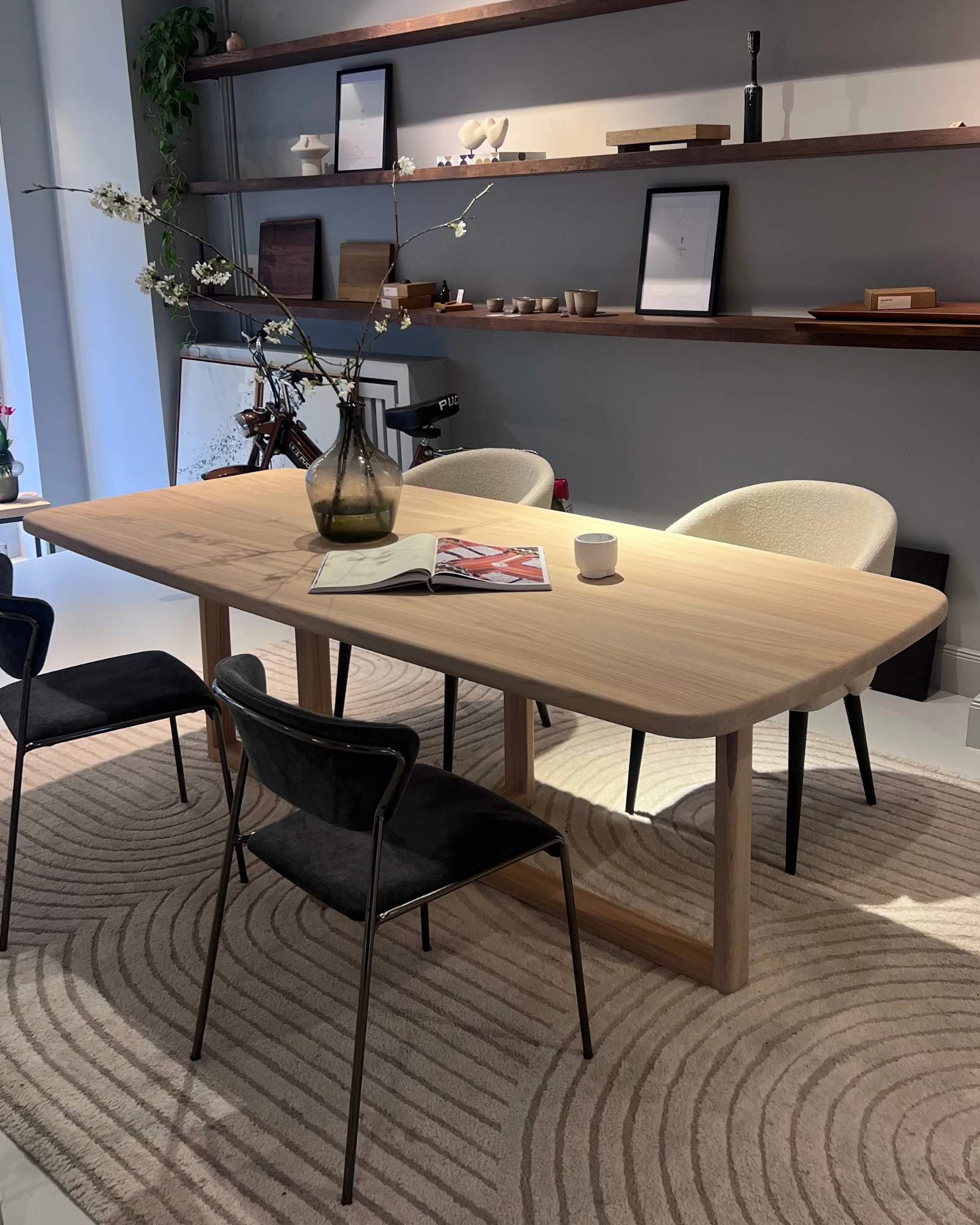 Die helle Esche und die sanft gerundeten Kanten verleihen ihm eine angenehme, beruhigende Präsenz. Das unaufdringliche Kreuzgestell sorgt für Stabilität, ohne den Raum zu dominieren.