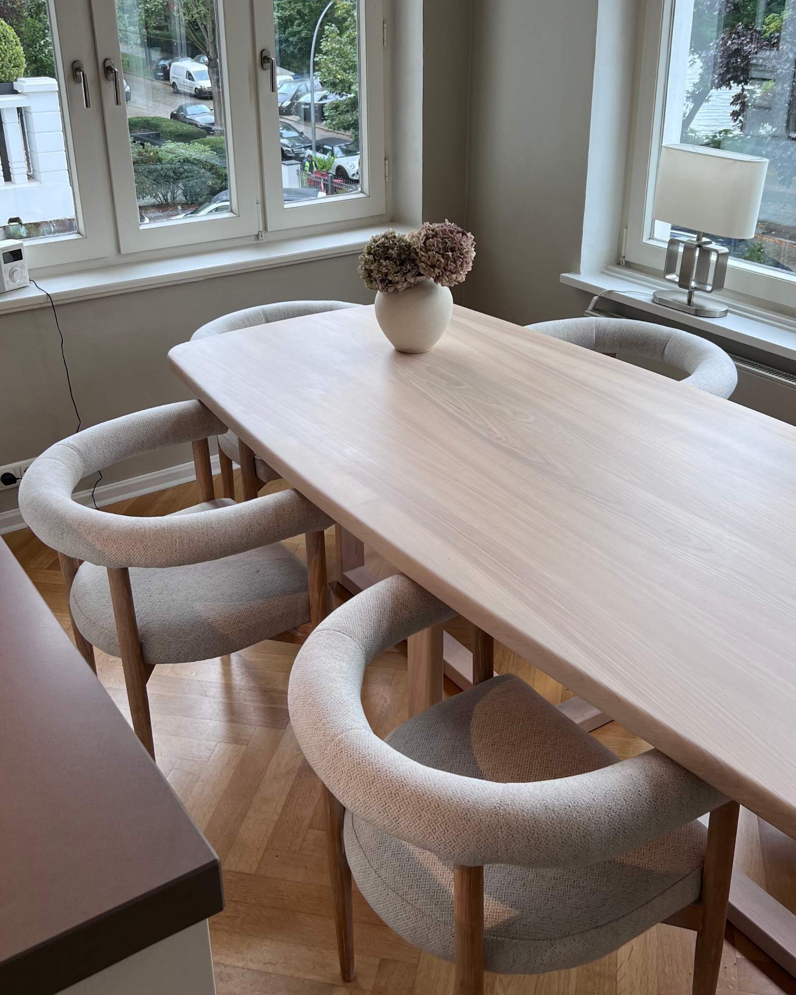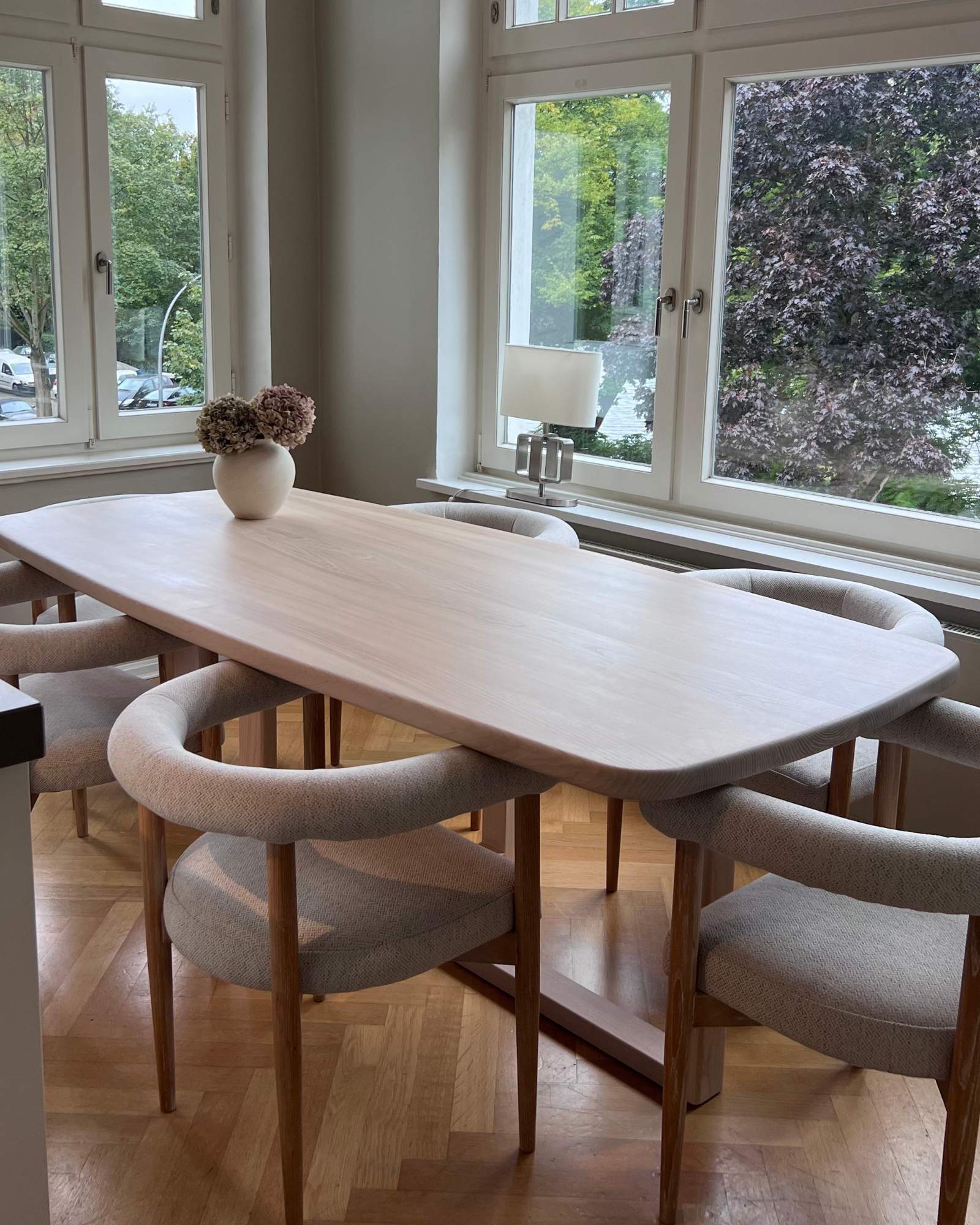 Der gesamte Tisch ist aus Esche gefertigt, einem Holz, das durch seine feine, gleichmäßige Maserung und seine helle Farbgebung besticht. Esche strahlt eine besondere Leichtigkeit und Natürlichkeit aus, die in jedem Raum eine einladende Atmosphäre schafft.