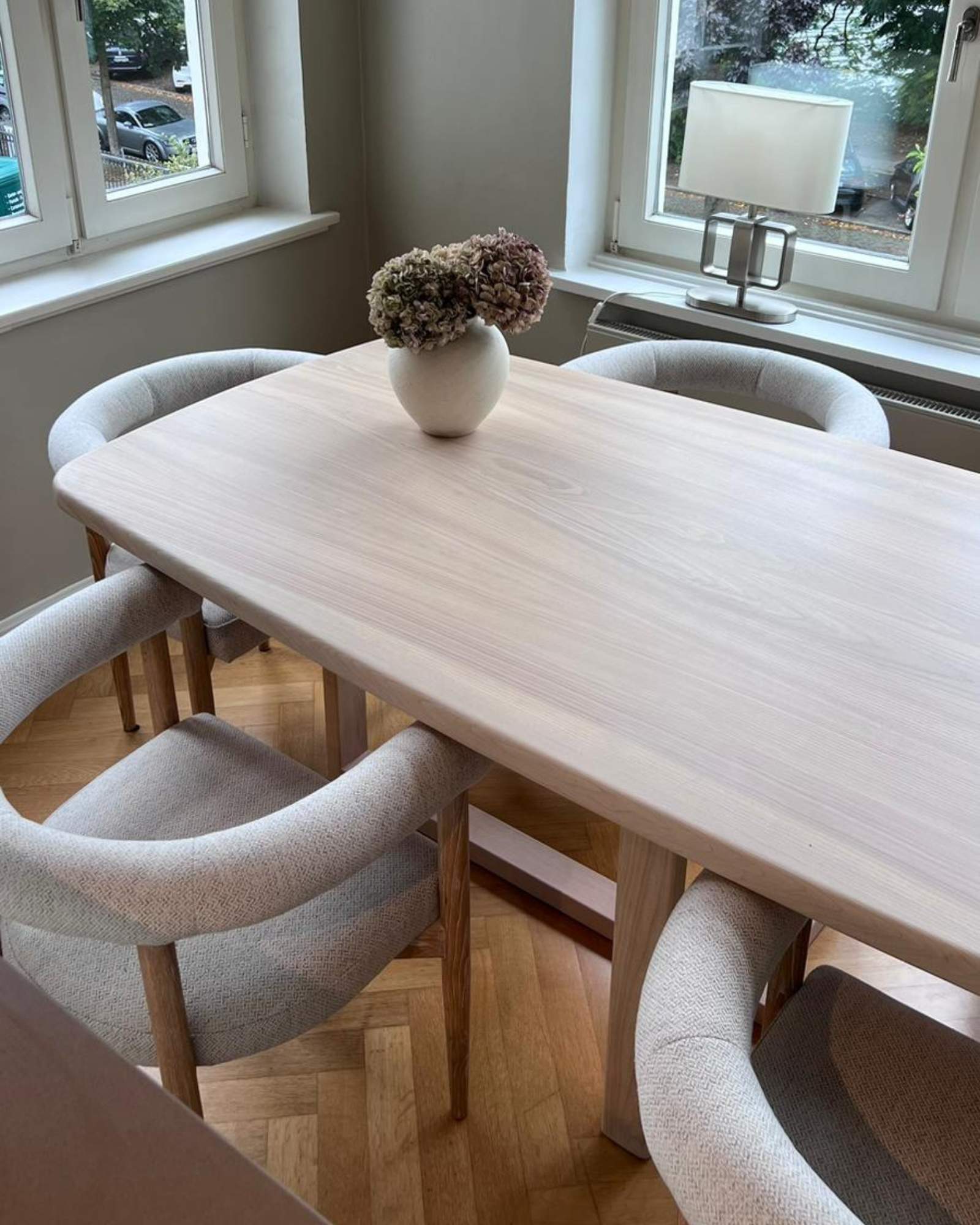 Die Oberfläche haben wir mit einer gleichmäßigen Bootsform veredelt und glatt geschliffen. So fühlt sie sich angenehm weich und geschmeidig an. Unser helles Smoke-Öl betont die natürliche Maserung dezent und gibt dem Tisch eine sanfte, warme Ausstrahlung. Und trotzdem: er ist super pflegeleicht.