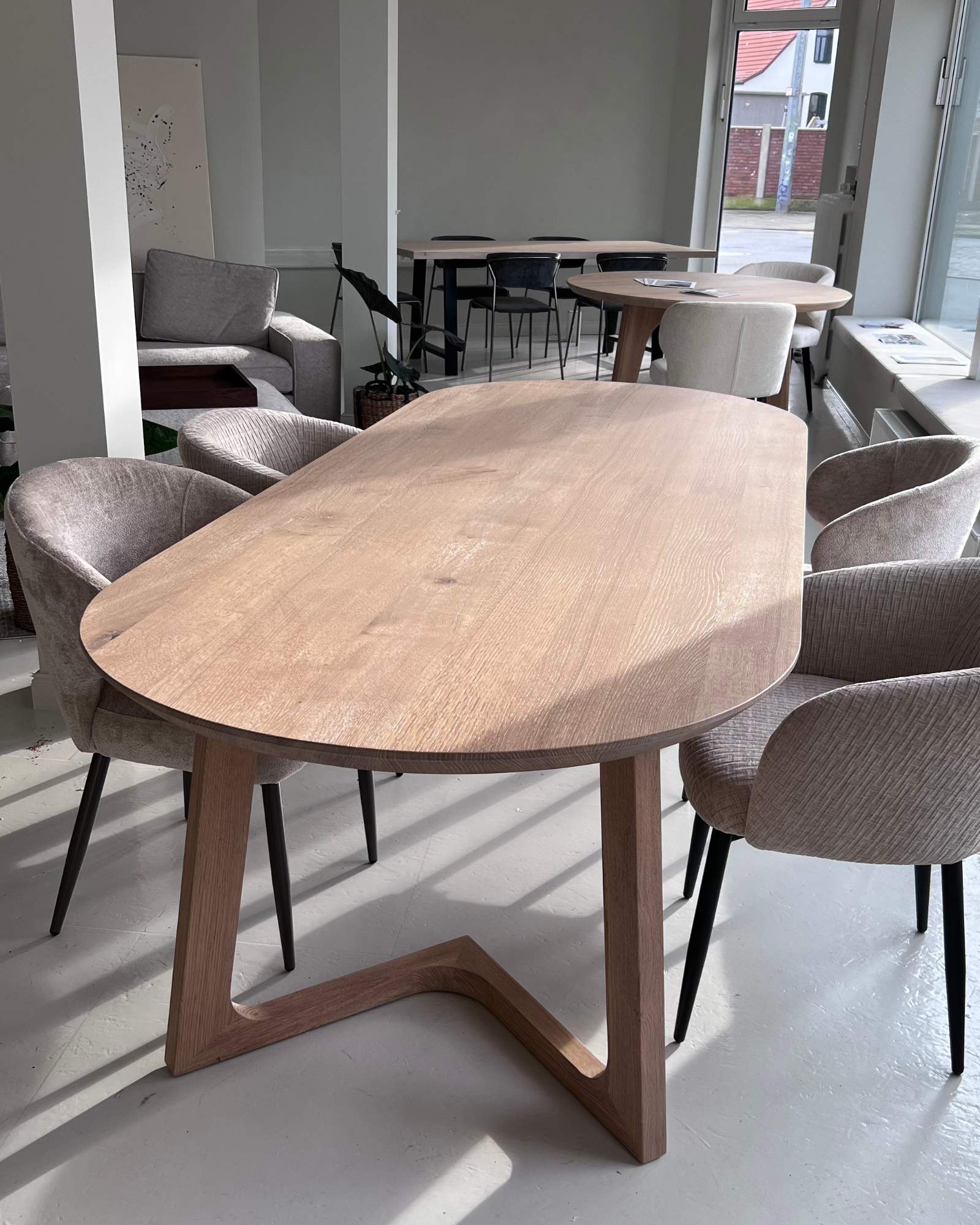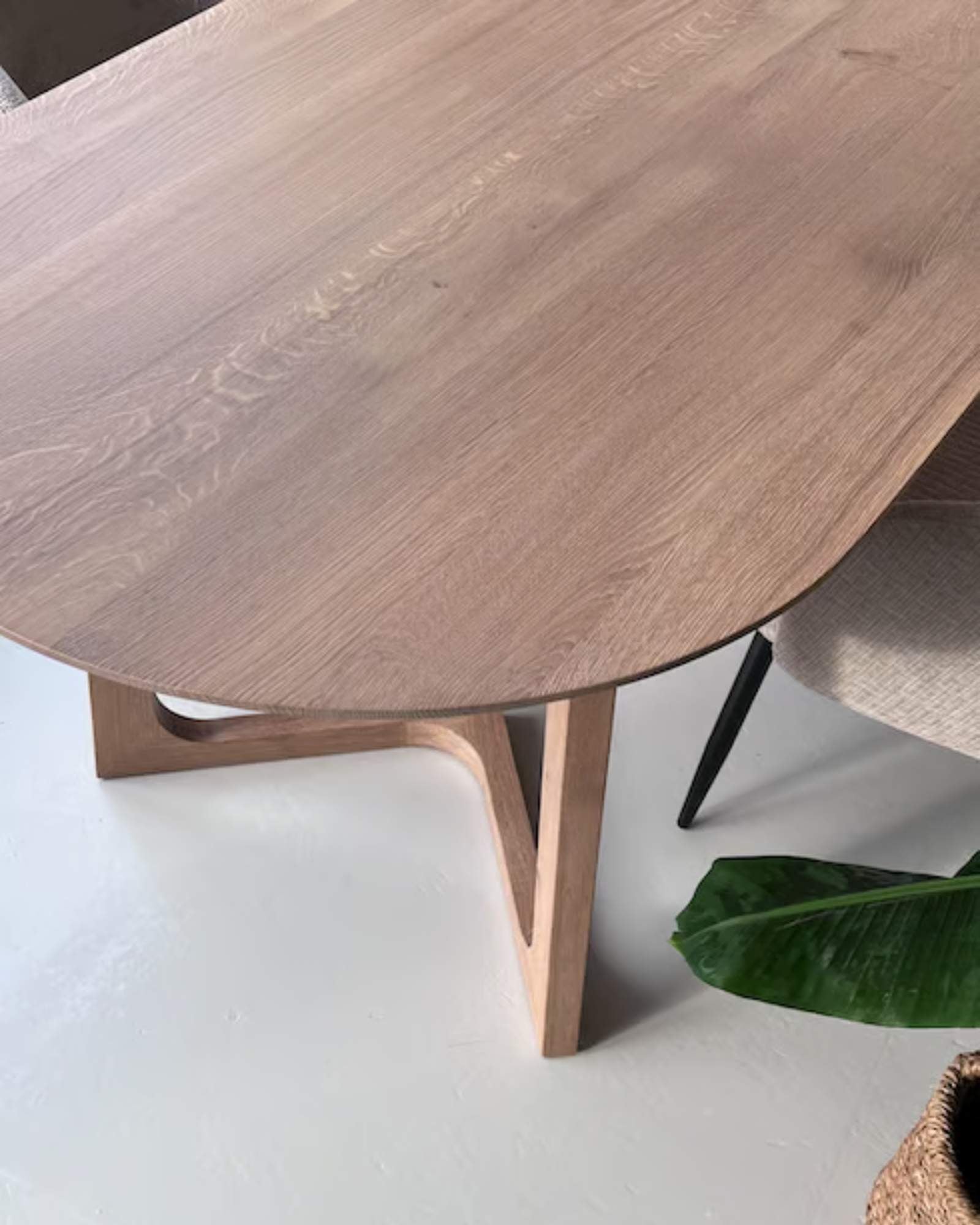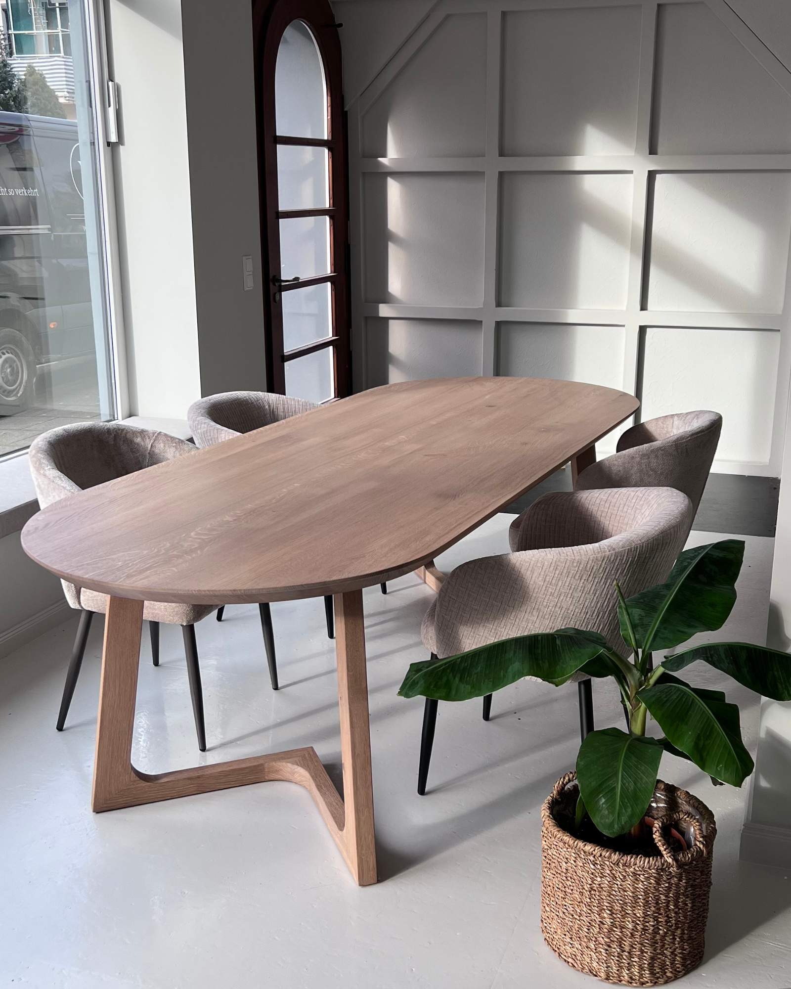 Helle Eiche in ovaler Form bringt Wärme, die abgeschrägte Platte Leichtigkeit.