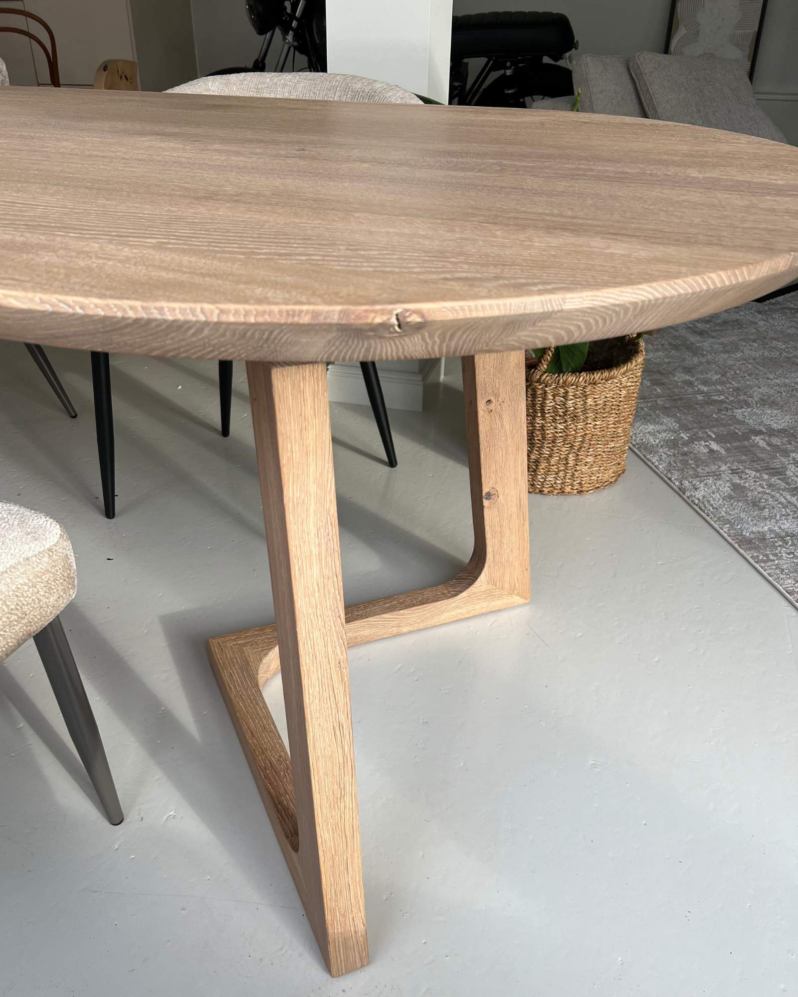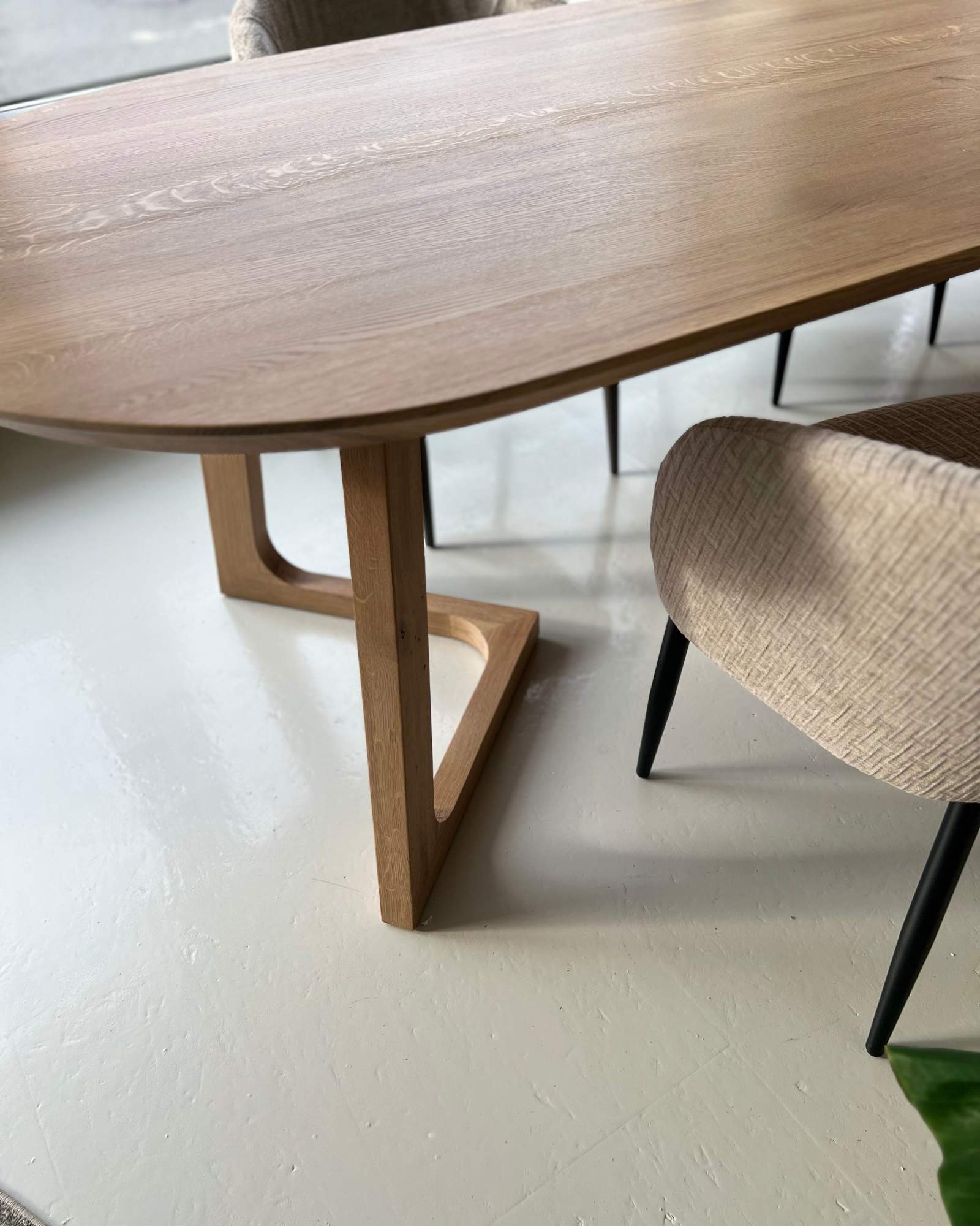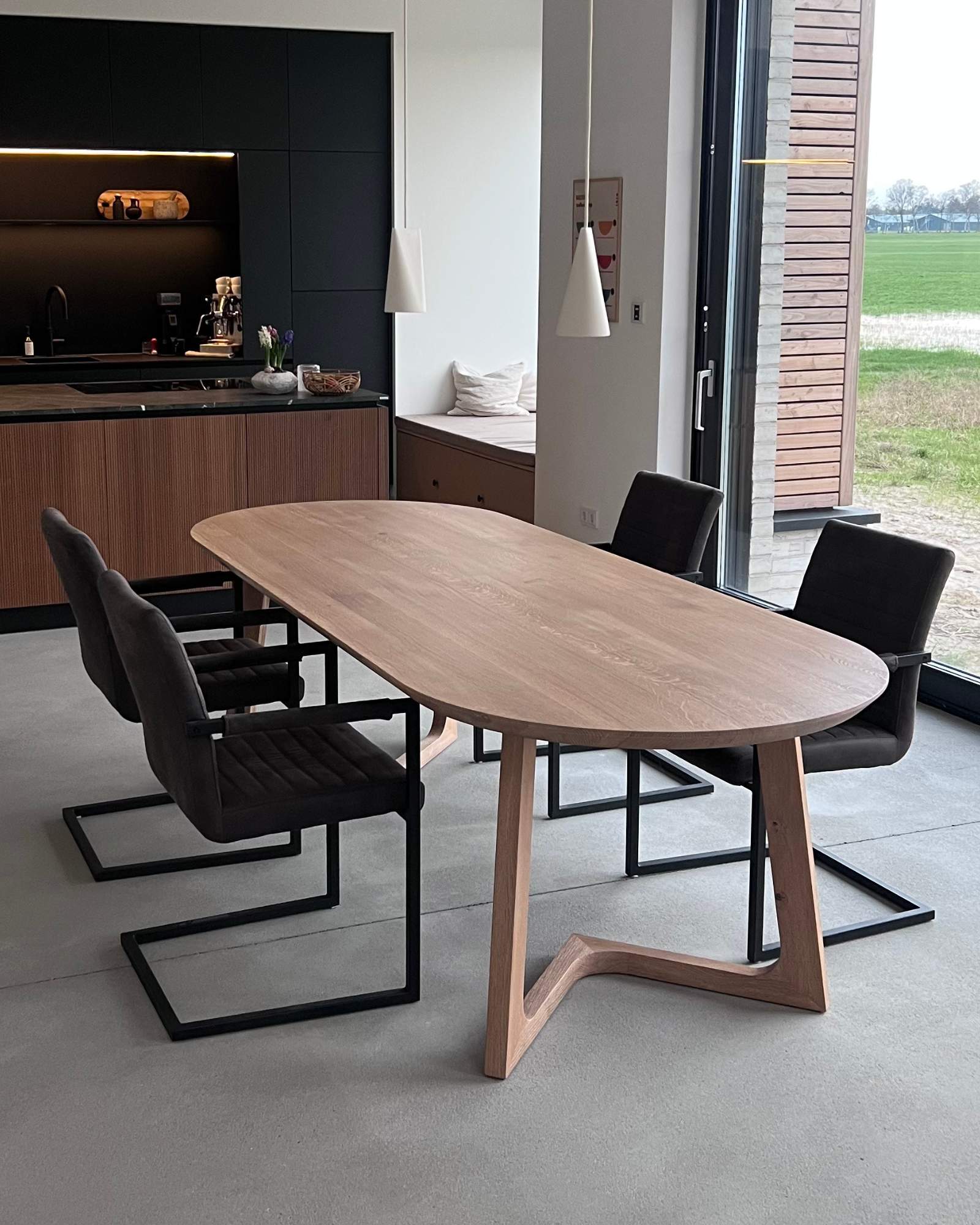 Helle Eiche in ovaler Form bringt Wärme, die abgeschrägte Platte Leichtigkeit.