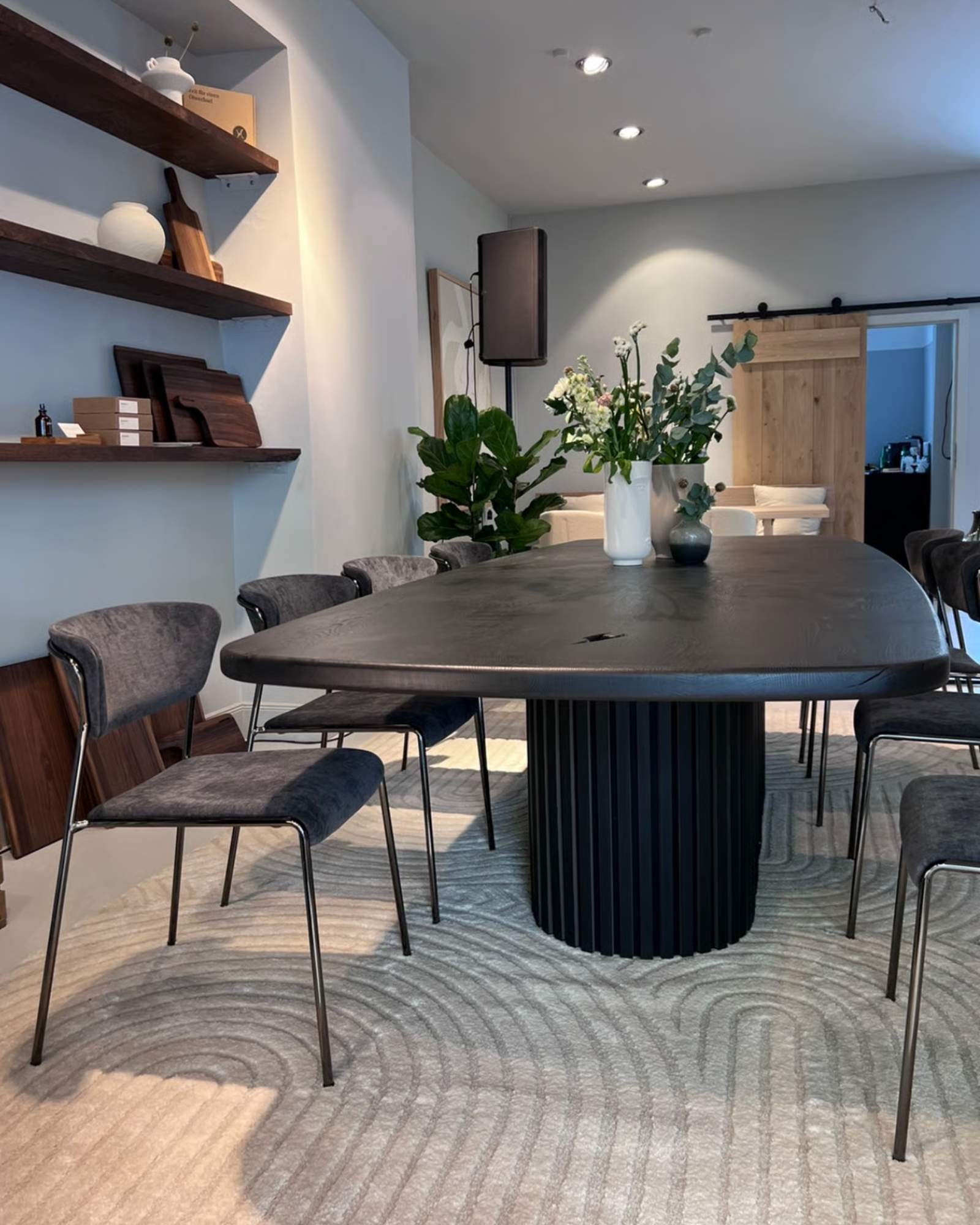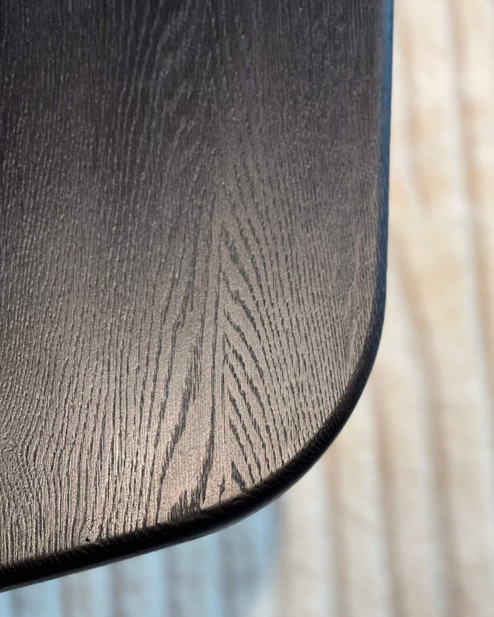 Die Form von NERO haben wir selbst entworfen und mit einer CNC-Fräse präzise in Form gebracht. Die massive Tischplatte aus Eiche wurde dunkel geschwärzt und geölt. Ihre Oberfläche zeigt kleine Äste und feine Risse – jedes Detail betont die natürliche Schönheit des Holzes und macht die Einzigartigkeit sichtbar.