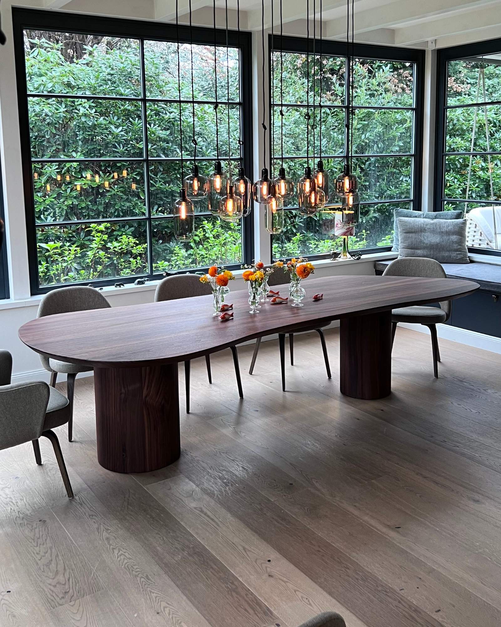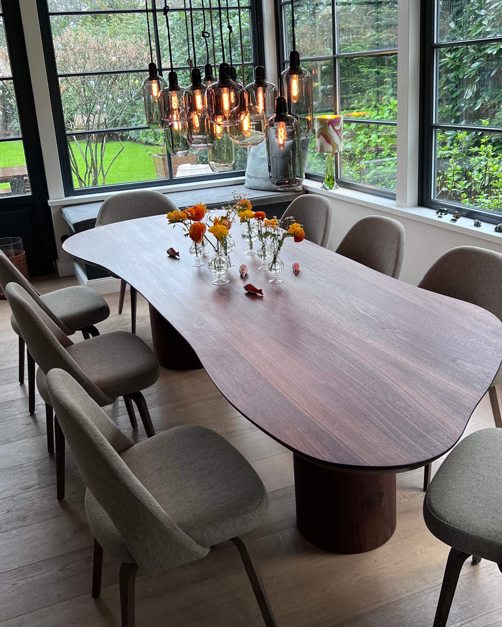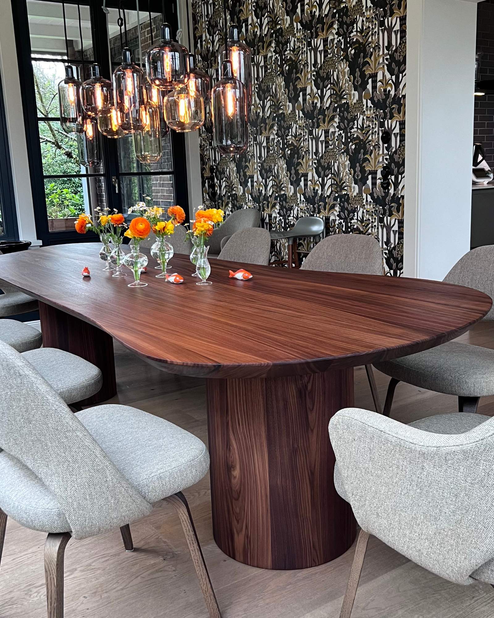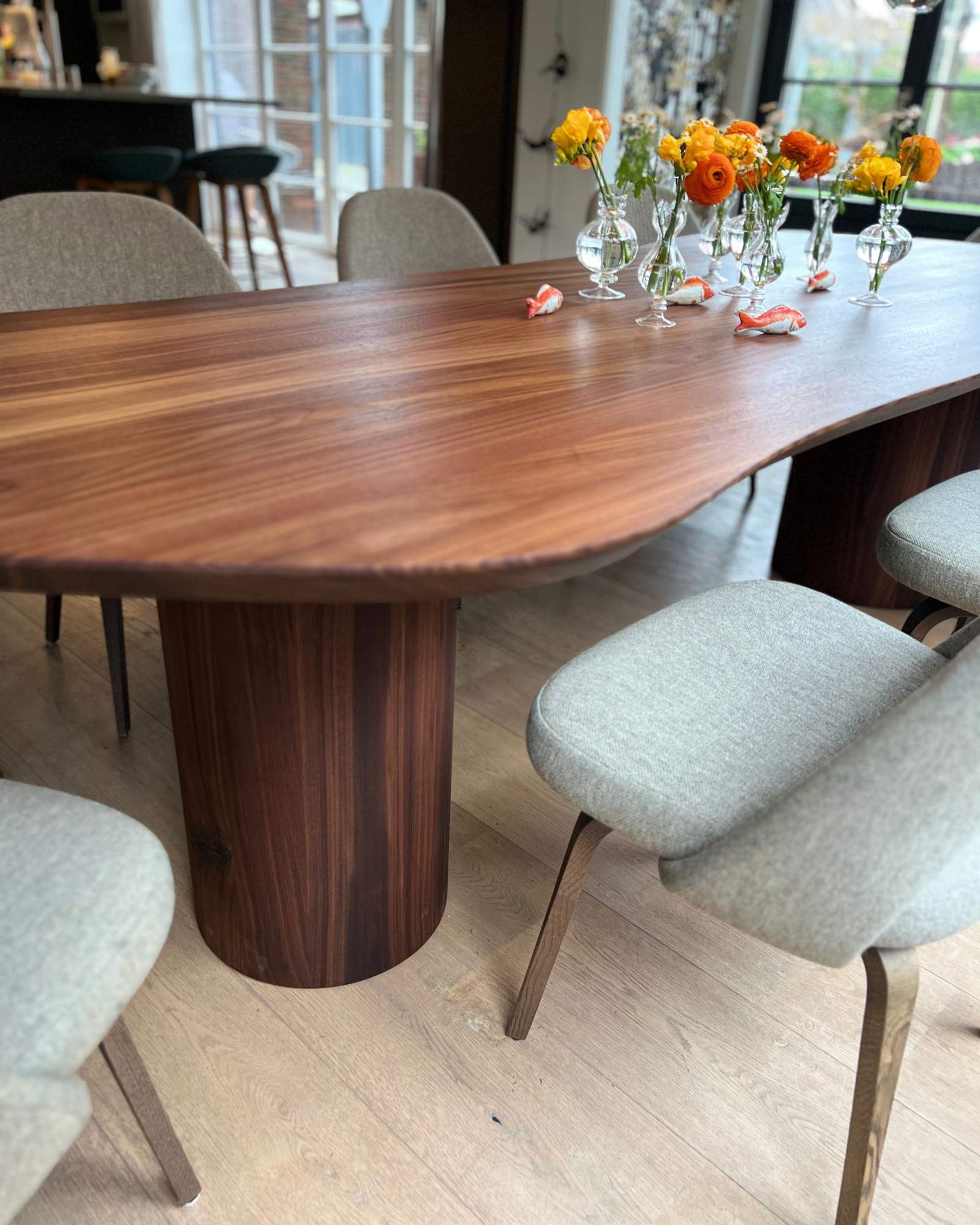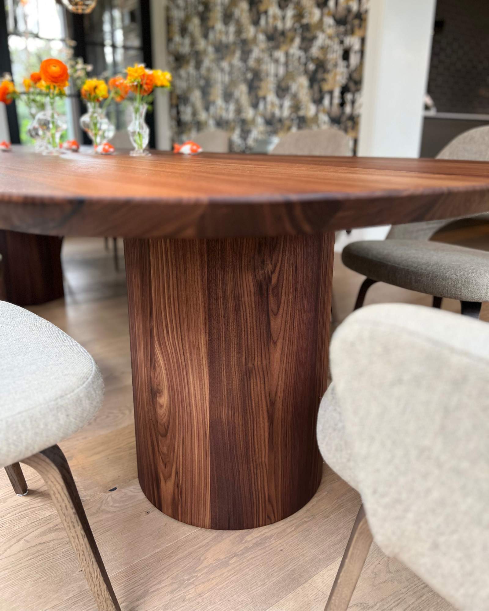 Gefertigt aus verleimtem Nussbaum greifen auch die runden Tischsäulen die Formensprache der Platte auf.