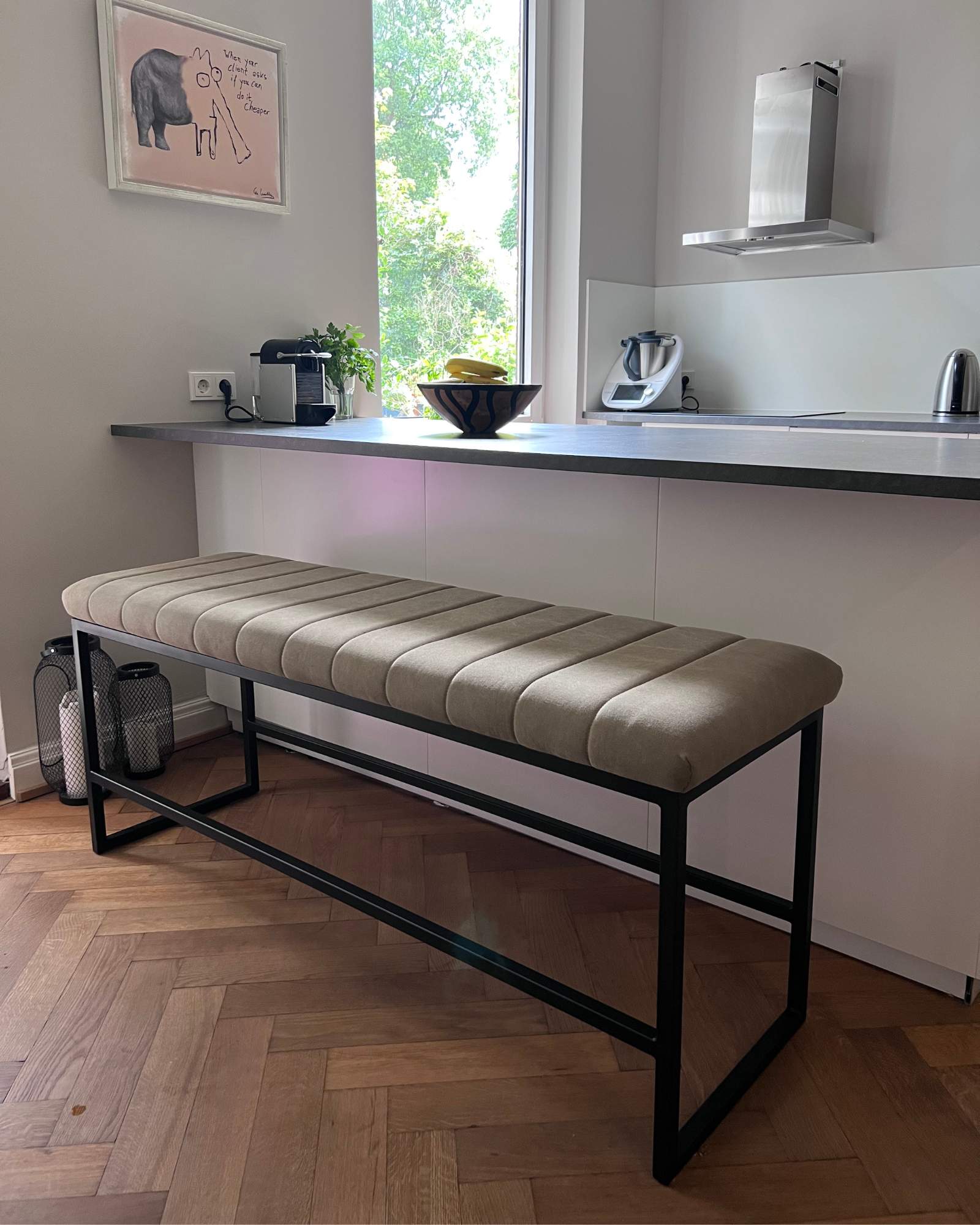 Das filigrane Stahlgestell bringt Leichtigkeit ins Design. Die seitlichen Längsstreben haben wir dabei bewusst so platziert, dass sie sich angenehm als Fußablage nutzen lassen – ein kleines Detail, das die Bequemlichkeit spürbar erhöht.