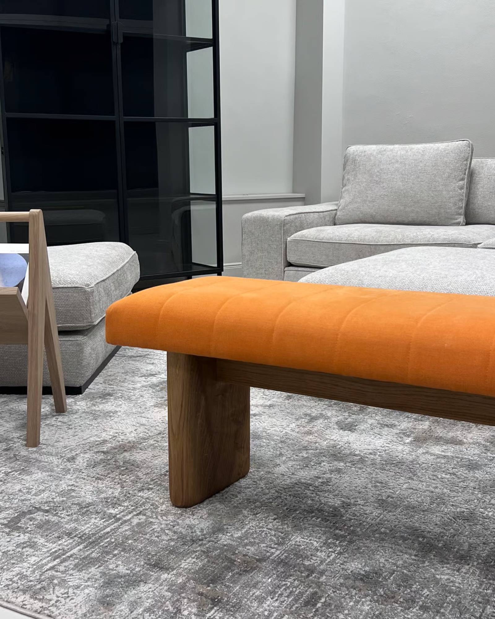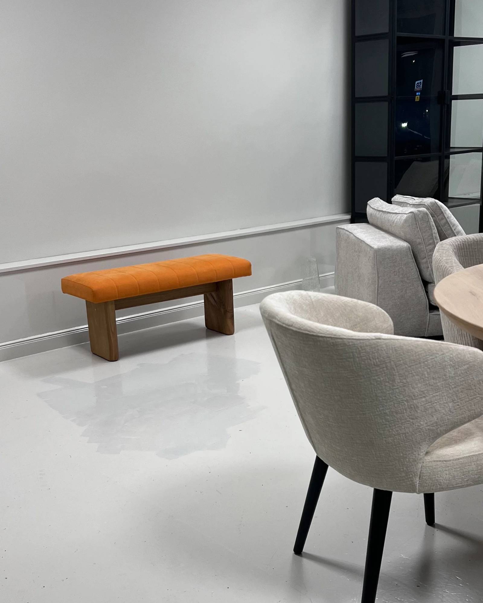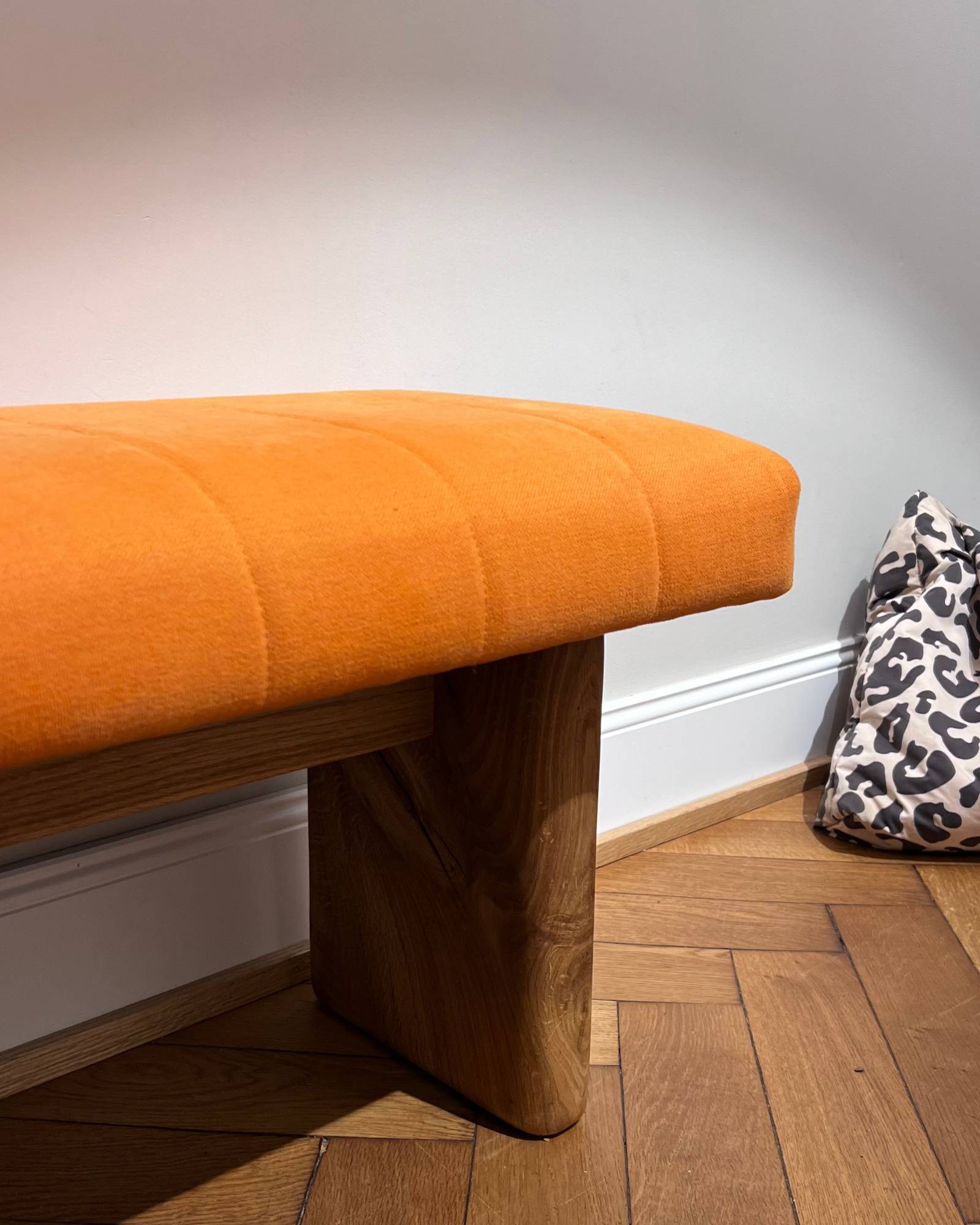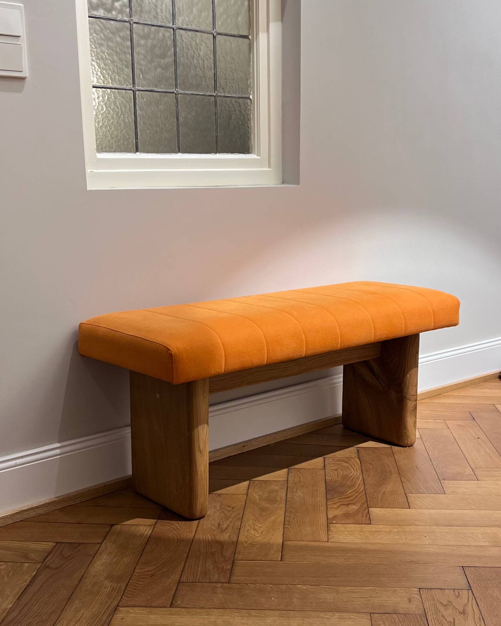 Polster in Aperol-Orange trifft massive Eiche: klar, warm, einladend.