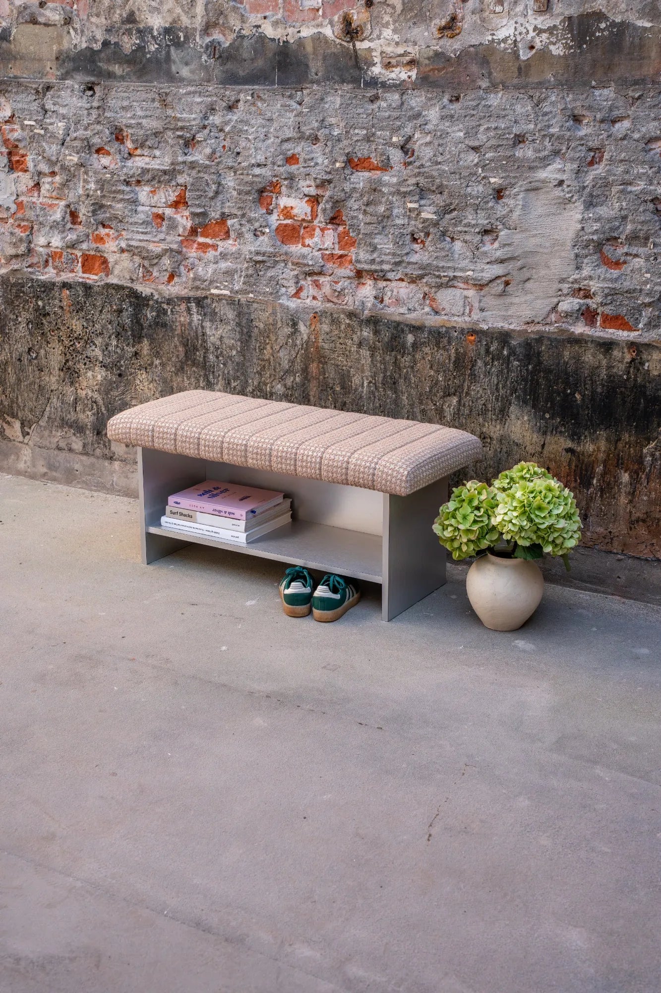 Ein Polster wie eine Welle, getragen von Aluminium – in einem warmen Apricot-Peach.